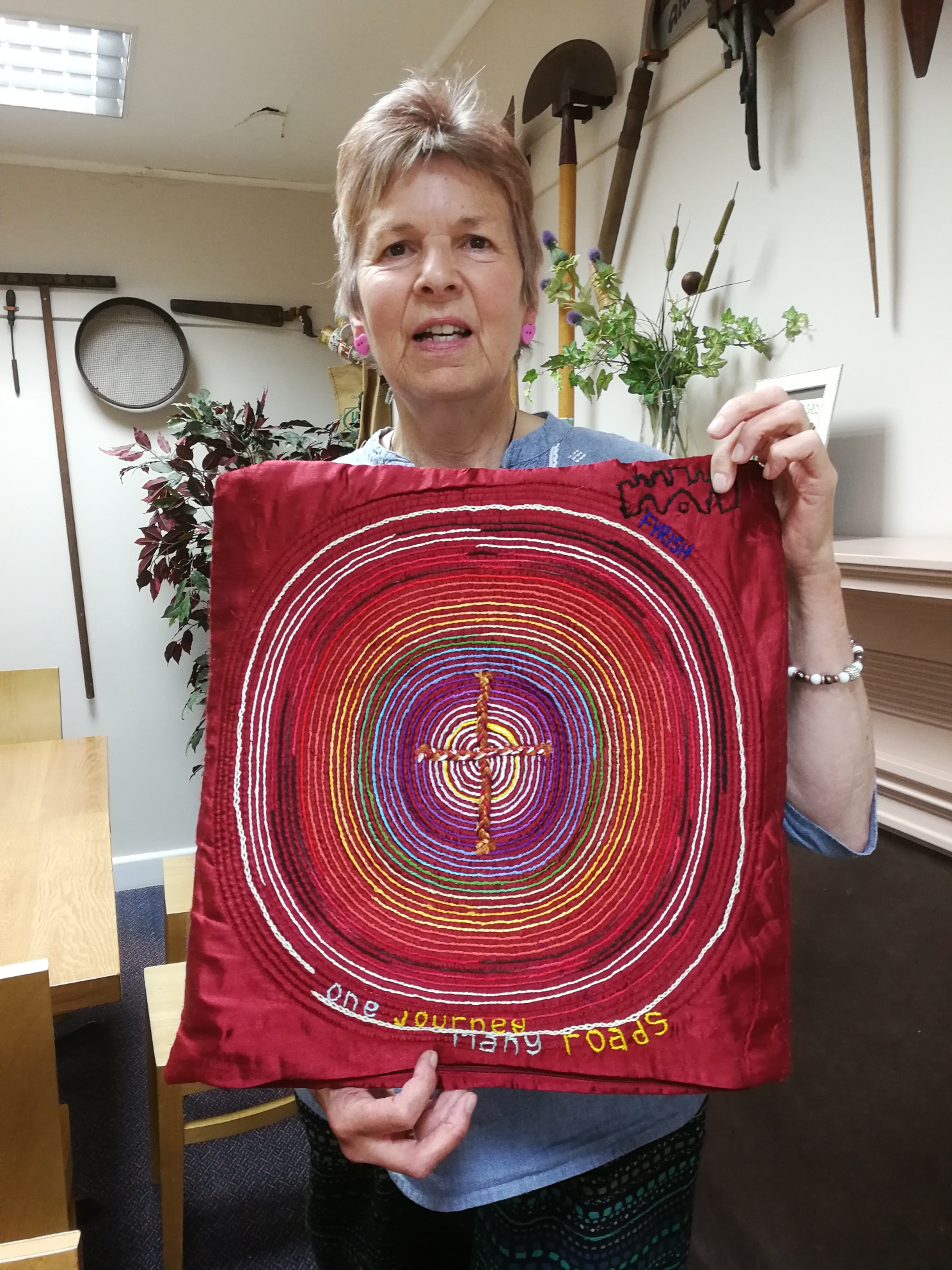 Irene had made a cushion cover which will go from Ross Presbytery to the National Meeting in September. This represents the theme for the next three years of “One Journey Many Roads”. Great design!