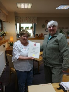 Anne Smith had been absent during the Moderator’s visit . So Janet Winchester presented her with her long-service certificate for more than thirty years.