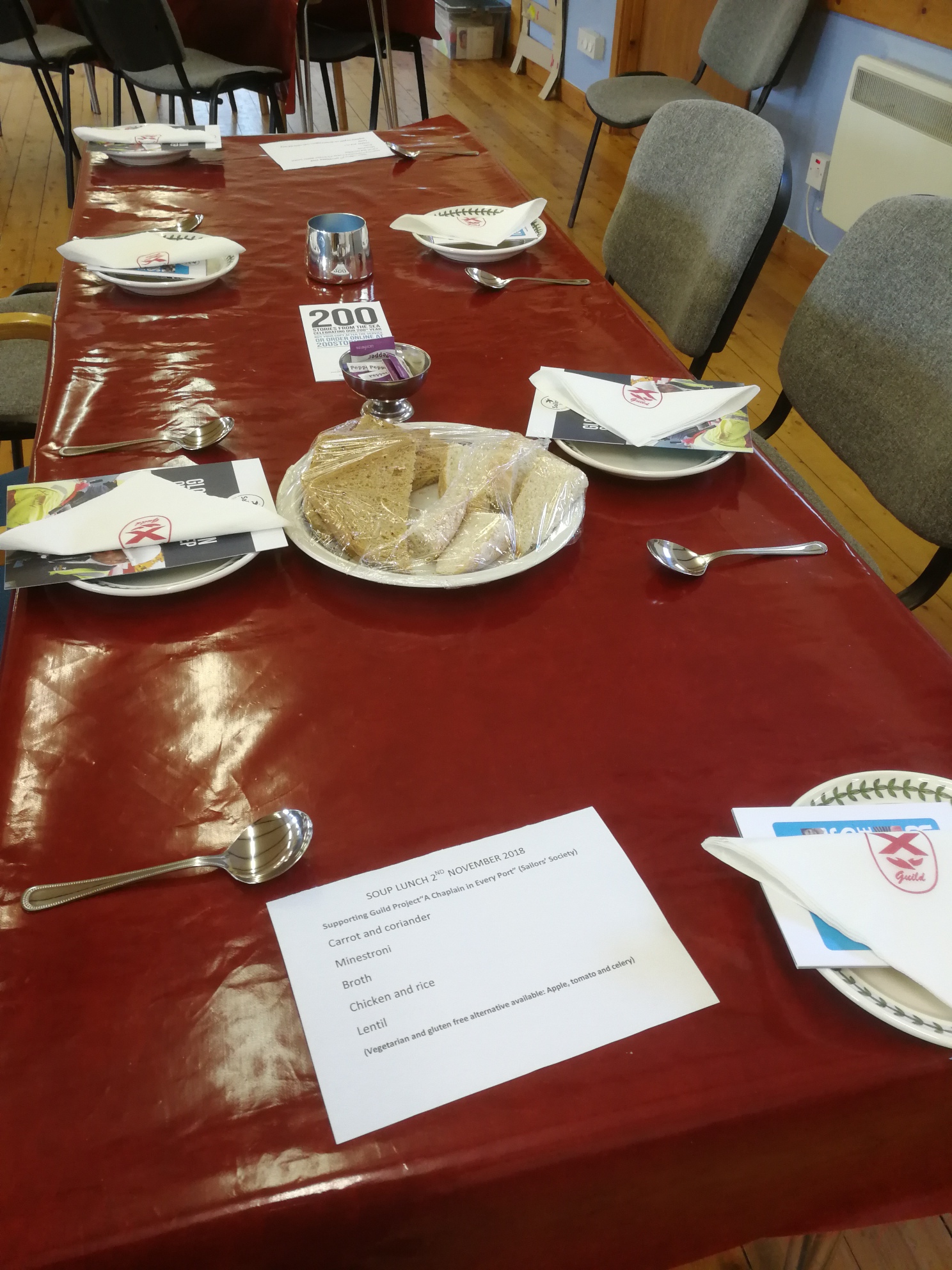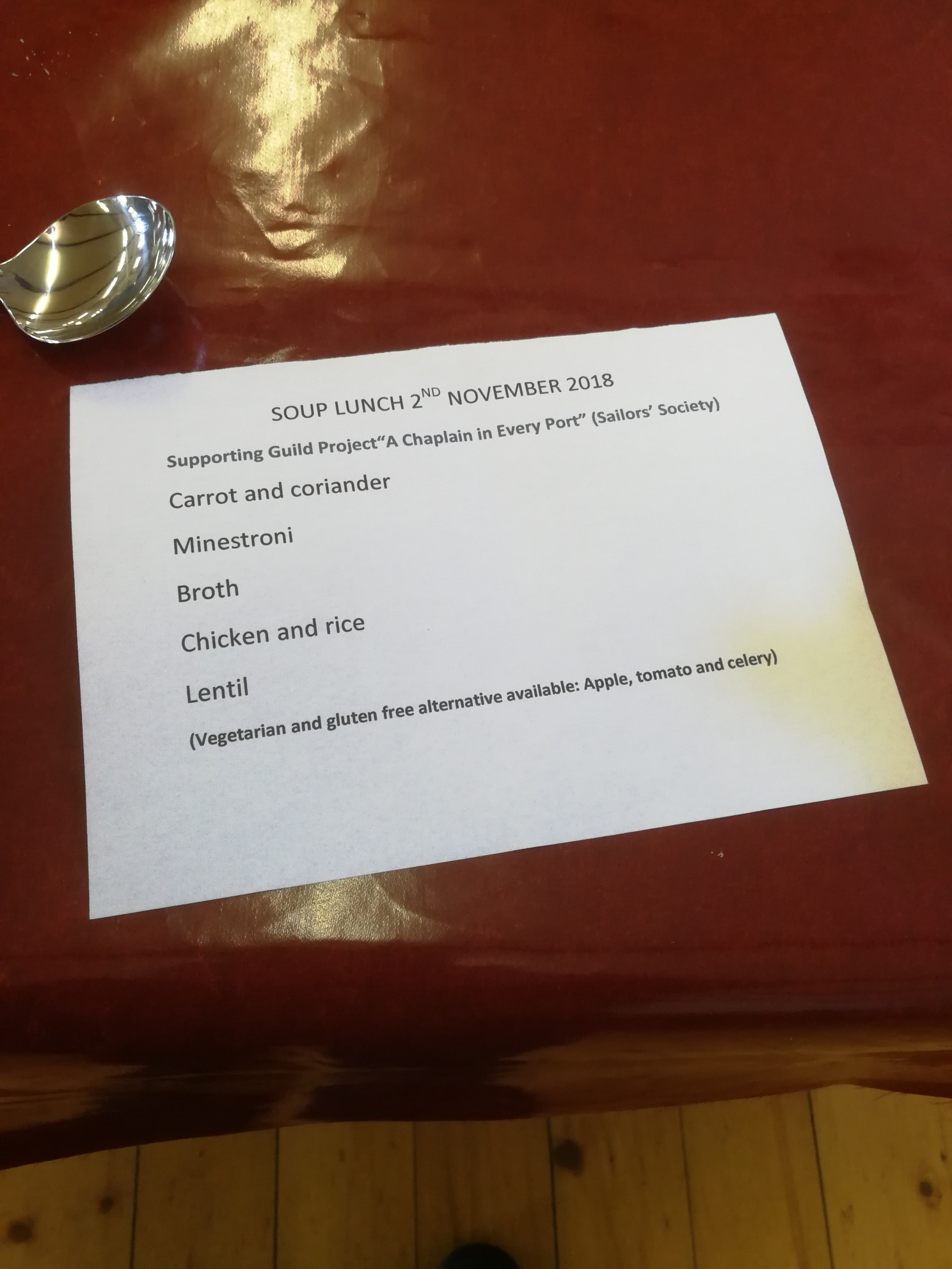 On Friday 2nd November, the Guild hosted the monthly Soup Lunch in the Church hall. The proceeds were to be donated to the Sailors Society to help in their fundraising for Chaplains in ports around the country to provide spiritual care and support to mariners who visit these shores from the many ships which call in to our ports. Despite a small turnout, the wonderful sum of £170 has been raised so far. Thank you to all who took part and made it a success.