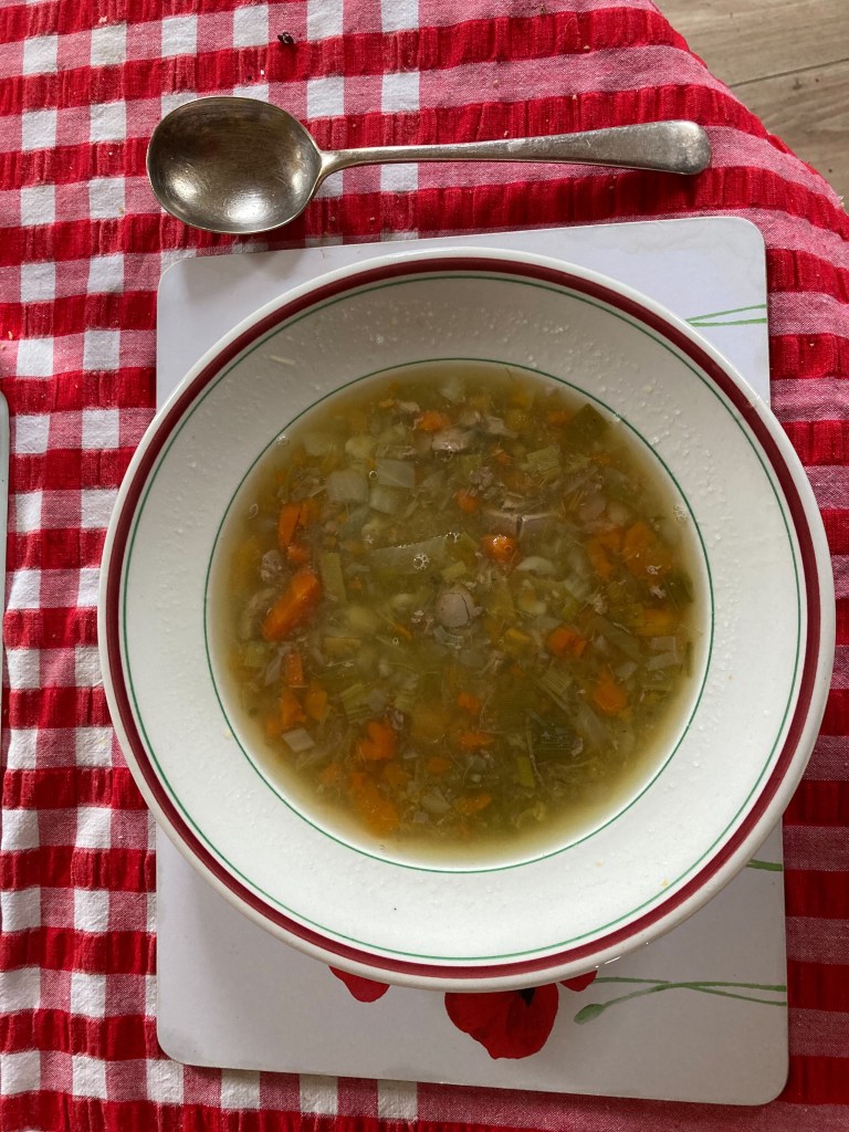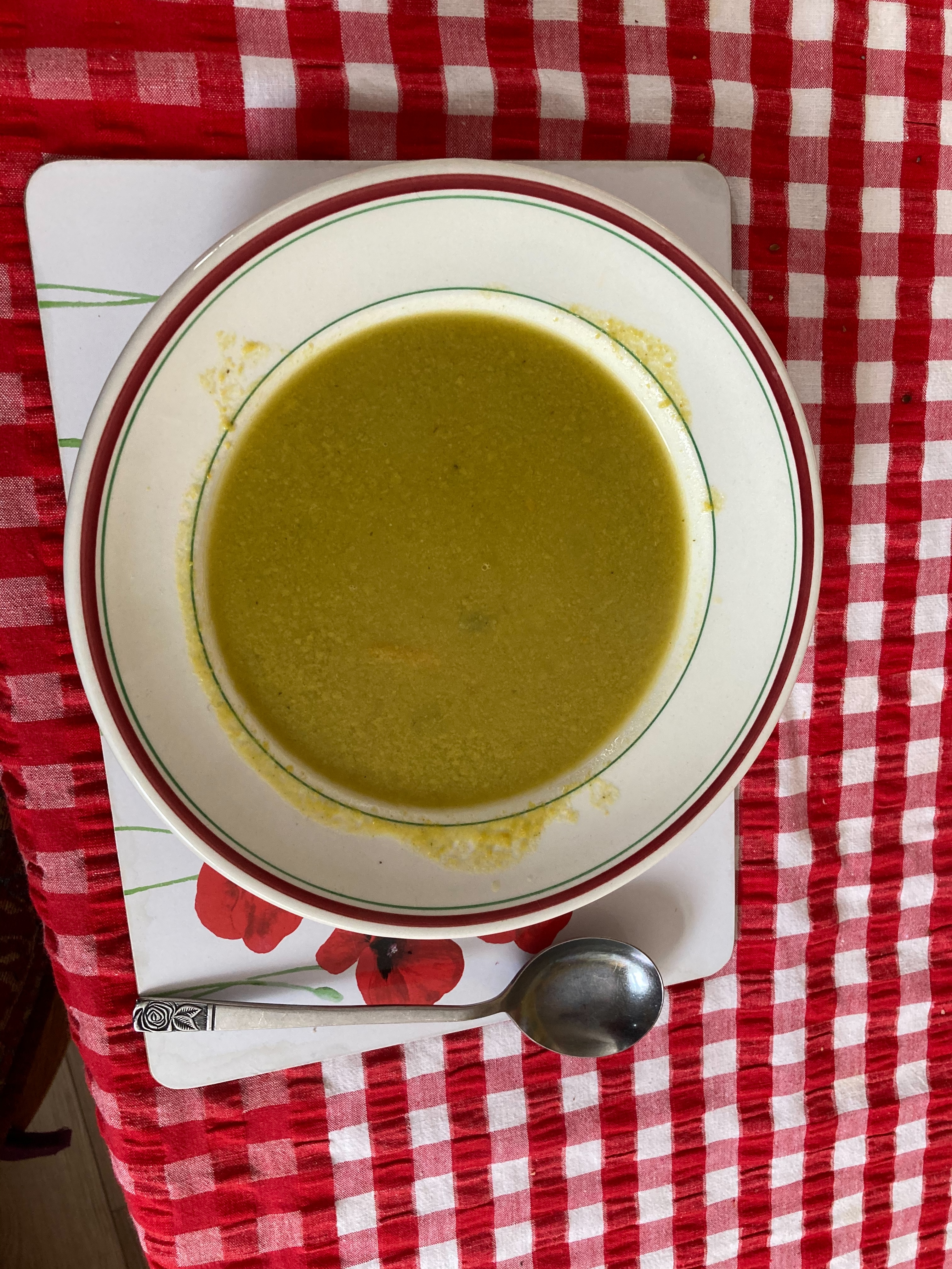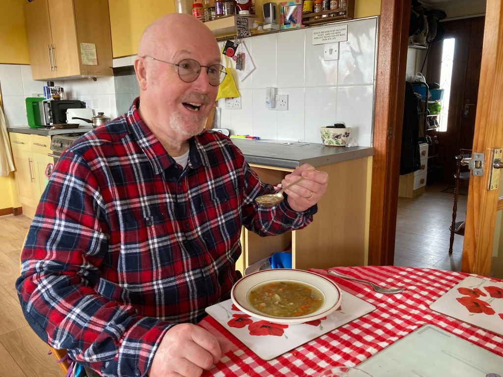 Irene and James are pictured with two different soups— kidney and pea and coconut. Sounds and looks delicious!